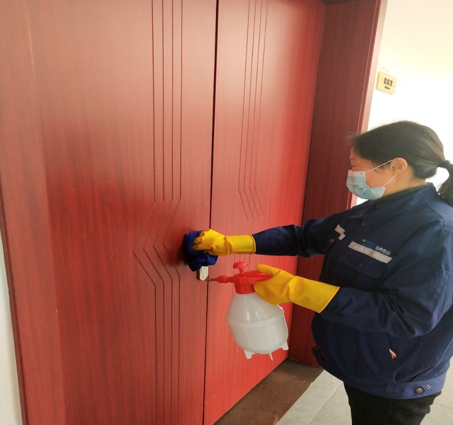 圖6-圖7 保潔員在對(duì)公共區(qū)域及門(mén)把手消毒