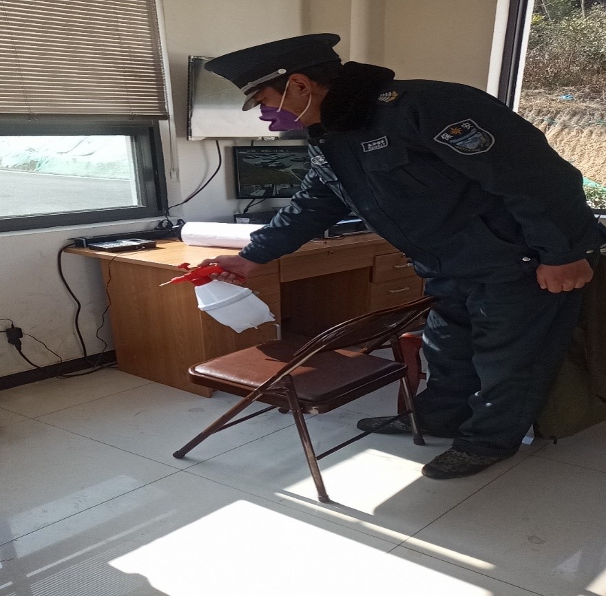 圖8 保安員正在對(duì)門(mén)崗內(nèi)進(jìn)行消毒噴霧